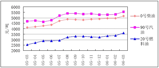 2006年,受各種因素作用的影響,國際油價(jià)持續(xù)在高位波動(dòng),3月份,布倫特原油(普氏現(xiàn)貨,下同)價(jià)格為61.2 美元/桶,同比上漲15.4%。成品油價(jià)格繼續(xù)上漲,95#無鉛汽油為68.9 美元/桶,同比上漲15.9%;柴油77.6 美元/桶,同比上漲16.1%。為緩解國內(nèi)成品油與原油價(jià)格倒掛的矛盾,3 月26 日,發(fā)展改革委再次提高成品油出廠價(jià)格,汽油、柴油價(jià)格分別提高300 元和200 元,調(diào)整后出廠價(jià)格分別為4700 元/噸和4070 元/噸,隨后,各地成品油價(jià)格紛紛上揚(yáng)。3 月末,國內(nèi)市場0 號柴油價(jià)格平均為5179 元/噸,比2 月提高4.26%;國內(nèi)市場90 號汽油價(jià)格平均為5567 元/噸,比2 月份提高4.5%;20 號燃料油價(jià)格為3615 元/噸,比2 月份提高6.76%。國家調(diào)高成品油價(jià)格效應(yīng)顯現(xiàn)。