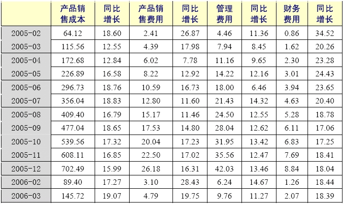2006年,水泥制造業(yè)成本上漲壓力較大,行業(yè)成本增長相對較快。由于銷售收入增速加快,銷售成本增速及費(fèi)用也相應(yīng)上升。 1季度,水泥制造業(yè)累計(jì)產(chǎn)品銷售成本為494.64億元,同比增長29.85%,增幅比上年同期上升了近13個百分點(diǎn);累計(jì)產(chǎn)品銷售費(fèi)用為19.33億元,同比增長21.37%,增幅比上年同期上升了16.82個百分點(diǎn);累計(jì)管理費(fèi)用為31.34億元,同比增長10.98%;累計(jì)財(cái)務(wù)費(fèi)用為16.14億元,同比增長23.16%。