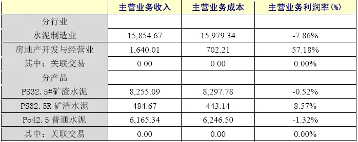 2006年1-9月,天津水泥股份有限公司累計生產(chǎn)水泥96.7萬噸,比上年同期增加16.7萬噸,同比增長20.88%;水泥銷量累計80.8萬噸,比上年同期增加16.5萬噸,增長25.66%;另一項主業(yè)房地產(chǎn)開發(fā)收入為1640萬元,同比減少1672.8萬元,下降50.5%。 由于水泥主業(yè)產(chǎn)銷規(guī)模增長,使三季度的主營業(yè)務(wù)收入同比略有增加,1-9月實現(xiàn)主營業(yè)務(wù)收入17494.7萬元,比上年同期增加698.7萬元,增長4.16%。其中:水泥產(chǎn)品銷售收入15854.7萬元,同比增加2371.7萬元,增長17.59%;房地產(chǎn)開發(fā)收入1640萬元,同比減少1672.8萬元,下降50.5%,主要因新開發(fā)項目尚未完全形成銷售所致;1-9月實現(xiàn)主營業(yè)務(wù)利潤為813萬元,比上年同期減少113萬元,下降12.2%,其中:水泥產(chǎn)品銷售利潤為虧損125萬元,同比增虧78萬元,主要是因產(chǎn)品結(jié)構(gòu)調(diào)整導致平均售價同比下降幅度高于平均成本同比下降幅度。由于公司報告期內(nèi)主營業(yè)務(wù)利潤偏低,期間費用同比增加,承擔期間費用后的營業(yè)利潤為虧損2688.4萬元,同比增虧726萬元;由于報告期內(nèi)公司取得的補貼收入1468萬元,抵補了部分營業(yè)利潤的虧損,使公司1-9月實現(xiàn)利潤為虧損1188萬元,比上年同期增虧438萬元,增幅為58.4%;公司1-9月凈利潤為虧損1194萬元,同比增虧262萬元,增幅28.15%。