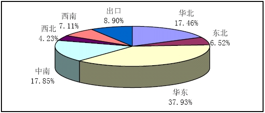 2006年,在重點統(tǒng)計單位中屬于企業(yè)直供銷售的鋼材有9095萬噸,占總銷量的32.41%;分銷11092萬噸,占總銷量的39.53%;分支機構(gòu)銷售3797萬噸,占總銷的13.53%;零售1580萬噸,占總銷量的5.63%;出口2499萬噸,占總銷量的8.9%。2006年,全國重點統(tǒng)計單位鋼材產(chǎn)品的地區(qū)流向主要是:華北地區(qū)4900萬噸、華東地區(qū)10644萬噸、中南地區(qū)5009萬噸,以上三大地區(qū)總銷量為20553萬噸,占銷售總量的73.24%。其余依次是西南地區(qū)1996萬噸(占7.11%)、東北地區(qū)1829萬噸(占6.52%)。銷售數(shù)量最少的地區(qū)是西北地區(qū)1188萬噸,僅占總銷量的4.23%。
