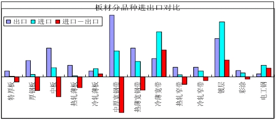 2006年1-12月份特厚、厚板、中板、熱軋薄板、中厚寬鋼帶、熱軋薄寬鋼帶、熱軋窄帶鋼、冷軋窄帶鋼、彩涂板帶為凈出口產(chǎn)品,但是冷軋薄板、冷軋薄寬帶鋼、鍍層板帶、和電工鋼仍為凈進口產(chǎn)品,而且冷軋薄寬帶和鍍層板帶的凈進口量仍占絕大部分。