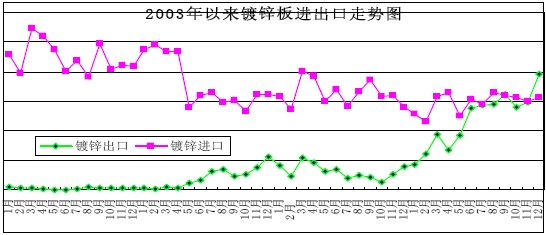 2006年我國進口鍍鋅板帶355.13萬噸,同比降低9.39%,其中寬度>600mm電鍍鋅板進口184.54萬噸,占進口量的51.96%,同比增長6.48%,寬度>600mm其他熱鍍鋅板進口149.43萬噸,占鍍鋅板進口量的42.08%,同比降低22.19%,鍍鋅板帶的主要進口國和地區(qū)是日本、中國臺灣、韓國、德國和巴西,其中從日本進口179.04萬噸,占進口量的50.42%,同比增長15.88%,從中國臺灣進口89.88萬噸,占進口量的25.31%,同比降低12.78%,從韓國進口72.28萬噸,同比增長12.63%,從德國進口2.74萬噸,同比增長45.84%,從巴西進口1.91萬噸,同比降低63.22%。從上述五國和地區(qū)進口285.71萬噸,占進口量的97.39%,進口國家比較集中。另外進口中國產鍍鋅板2.09萬噸,同比增長173.56%。