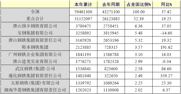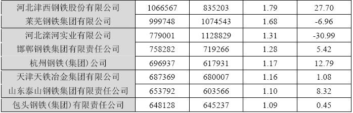 2006年,我國熱軋薄板帶產(chǎn)量5946.13萬噸,同比增長37.42%,重點統(tǒng)計單位產(chǎn)量只有3115.21萬噸,同比增長19.25%,占全國產(chǎn)量的52.39%,產(chǎn)品的生產(chǎn)集中度較低。從分品種看,重點統(tǒng)計企業(yè)的熱軋薄寬帶鋼產(chǎn)量占全國產(chǎn)量的69.73%,所占比例有所下降,而熱軋窄帶和熱軋薄板的產(chǎn)量較低。產(chǎn)量最大是唐山國豐,其產(chǎn)量占全國總量的6.36%,寶鋼產(chǎn)量占5.48%,唐鋼占5.32%。