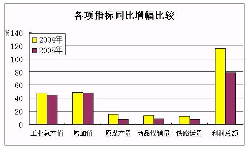 2005年,全國規(guī)模以上煤炭企業(yè)完成工業(yè)總產(chǎn)值5360億元,同比增長44.7%,增幅比去年下降了3個(gè)百分點(diǎn);完成工業(yè)增加值2805億元,同比增長47.9%,雖高于全國工交行業(yè)增加值增幅36.6個(gè)百分點(diǎn),但僅占全國規(guī)模以上工業(yè)增加值的4.2%。