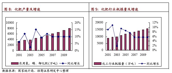 預(yù)計(jì)07 年、08 年化肥產(chǎn)量分別為6022 萬噸和6624.4 萬噸,同比分別增長10%和10%?紤]到每年4%的節(jié)能降耗,預(yù)計(jì)07 年、08 年的化肥行業(yè)煤炭消耗量為12634 萬噸和13362 萬噸,同比增長5.77%和5.77%。