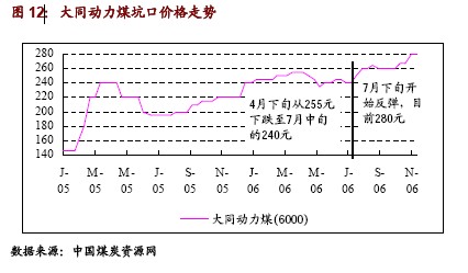 從7 月底開始,大同動力煤坑口價(不含稅)受需求拉動上漲至8 月底的265 元/噸,9 月份回調(diào)到260 元,10 月份上漲7 元/噸,11 月煤炭價格上漲13 元/噸至目前為280 元/噸,不斷創(chuàng)出年內(nèi)新高。