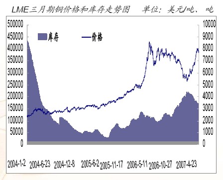 2007年3月份我國進(jìn)口精銅達(dá)202,955噸,環(huán)比增長了36.5%,同比增長則高達(dá)148.5%;1~3月份的累計進(jìn)口量為483,385噸,同比增長134.8%。07年1~3月份,中國銅進(jìn)口強勁增長是支撐2007年銅價回升的最大驅(qū)動力。