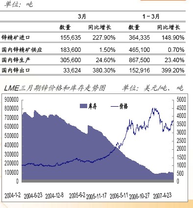1~3月份我國凈出口精鋅15.29萬噸,同比增長(zhǎng)399.20%。2006年11月鋅現(xiàn)貨升水保持在100美元左右,進(jìn)入2007年后,現(xiàn)貨升水開始下降,目前,鋅現(xiàn)貨僅升水15-21美元/噸。
