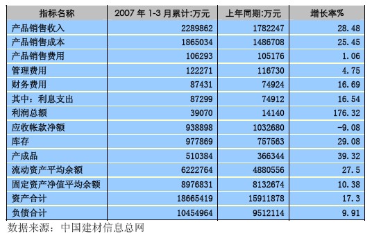根據(jù)中國建材信息總網(wǎng)統(tǒng)計:2007年1-3月份匯總水泥上報企業(yè)141戶,匯總產(chǎn)品銷售收入為2289862萬元,比上年同期增長28.48%;利潤總額為39070萬元,與去年同比增長176.32%;工業(yè)總產(chǎn)值(現(xiàn)價)完成2151334萬元,比上年同期增長了19.67%;工業(yè)銷售產(chǎn)值(現(xiàn)價)完成2002895萬元,比上年同期增長了19.24%。具體見下表2: