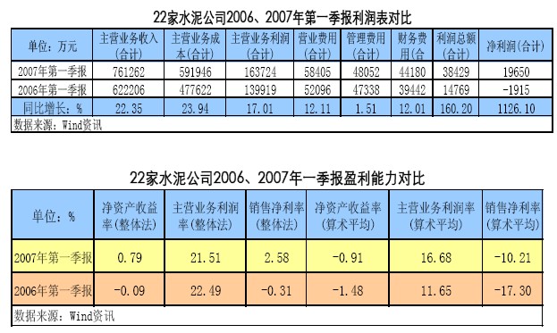 相對來說,一季度是水泥行業(yè)的淡季。2007年一季度水泥行業(yè)表現(xiàn)出淡季不淡的特點,這從上市公司公布的季報中也反映出來。