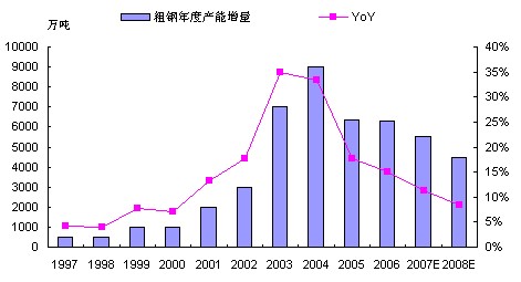 統(tǒng)計(jì)顯示,2006年以來(lái)煉鐵、煉鋼產(chǎn)能增速均下降至15%以下,近幾年煉鐵煉鋼大規(guī)模投資接近尾聲,粗鋼產(chǎn)量增速將放緩 。且 2007年以來(lái)國(guó)家沒(méi)有批準(zhǔn)任何新建項(xiàng)目,寶鋼、武鋼等項(xiàng)目需等淘汰取得實(shí)質(zhì)效果后才放行 。