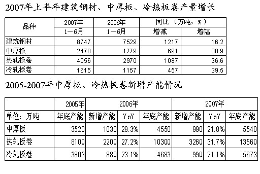 受節(jié)能減排及淘汰落后影響,建筑鋼材產(chǎn)能釋放受到限制,供應(yīng)壓力較小 ;中厚板產(chǎn)量增長較快,但下游造船、石油氣管線等行業(yè)需求旺盛,隨著產(chǎn)能增長放緩,供應(yīng)壓力不大 ;冷熱板卷2007年新投產(chǎn)產(chǎn)能較多,供應(yīng)壓力較大,下游汽車機(jī)械造船集裝箱需求高速增長;板材產(chǎn)能在2008年將緩解。