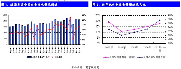 2007年1-4月,全國(guó)火電發(fā)電量為8330.9億千瓦時(shí),同比增長(zhǎng)17.6%,占全部發(fā)電量的比重高達(dá)87.3%,與06年相比,占比提高了4.2個(gè)百分點(diǎn)。從歷史數(shù)據(jù)可以看出,自2004年以來(lái),火電發(fā)電量增速及其占全國(guó)總發(fā)電量之比呈上升趨勢(shì)。