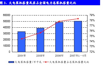 2007年1-4月,全國(guó)電力建設(shè)新增生產(chǎn)能力(正式投產(chǎn))2103.19萬(wàn)千瓦,其中火電新增裝機(jī)容量占93.8%,高達(dá)1972.7萬(wàn)千瓦。從目前的電力裝機(jī)投資情況來(lái)看,未來(lái)幾年火電新增裝機(jī)容量將繼續(xù)快速增長(zhǎng)。