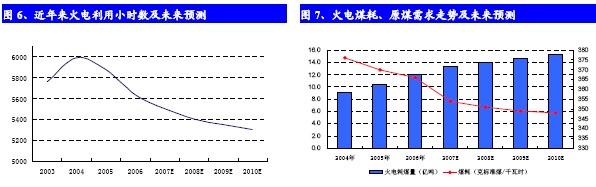 近年來(lái)火電利用小時(shí)數(shù)在2004年達(dá)到5991小時(shí)之后開(kāi)始呈下降趨勢(shì),隨著全國(guó)電力新增裝機(jī)容量的投產(chǎn),這種趨勢(shì)還將保持一段時(shí)間,預(yù)計(jì)“十一五”期間新增裝機(jī)容量主要集中在2007和2008年投產(chǎn),我們估計(jì),2007年全國(guó)火電利用小時(shí)數(shù)將下降到5400左右,2010年進(jìn)一步下降到5300小時(shí)左右!