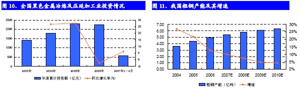 2007年1-5月投資增速4.6%。而且目前的鋼鐵行業(yè)投資主要集中于下游的軋鋼領域,用于粗鋼產(chǎn)能的投資增長有限。結(jié)合國家鋼鐵行業(yè)產(chǎn)能淘汰政策,預計未來幾年我國鋼鐵業(yè)產(chǎn)能增長將進入平穩(wěn)期,粗鋼產(chǎn)量增速預計在5~10%之間,生鐵產(chǎn)量增速預計在8~14%之間。