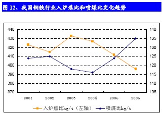 盡管自2003年以來,我國鋼鐵行業(yè)的入爐焦比開始降低,而2004年以來噴煤比開始上升,但與國外發(fā)達國家相比,仍然存在一定的差距。