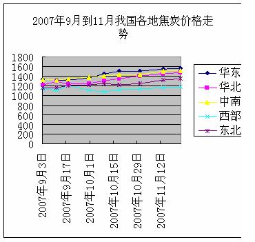 1.焦炭?jī)r(jià)格不斷上漲 在07年9月份,焦炭市場(chǎng)行情步入大幅上漲的局面,部分焦化企業(yè)已經(jīng)調(diào)整30至50元/噸左右,隨后華東及河北部分地區(qū)上漲30至40元/噸,東北地區(qū)也在觀望后也上調(diào)50元/噸左右。另外,華北地區(qū)的焦化企業(yè)經(jīng)過(guò)艱苦談判,“八五”之爭(zhēng)在鋼廠(chǎng)用戶(hù)接受80元/噸漲幅的協(xié)議下結(jié)束。至此,焦炭市場(chǎng)新的一輪價(jià)格上漲基本完成,市場(chǎng)逐漸進(jìn)入盤(pán)整局面。10月到11月中旬,全國(guó)的焦炭?jī)r(jià)格保持了比較穩(wěn)定的增長(zhǎng)態(tài)勢(shì)(參見(jiàn)下圖);诿禾糠植嫉牟黄胶,各地的市場(chǎng)價(jià)格每噸也相差十幾元到上百元不等,尤其是焦炭需求比較旺盛的華東地區(qū)和煤炭資源豐富的地區(qū)基本保持了每噸上百元的差距。