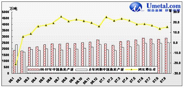 在2007年9月份,全國(guó)焦炭產(chǎn)量為2890.25萬(wàn)噸,,較8月份的2,795.84萬(wàn)噸增加了4.16萬(wàn)噸,10月全國(guó)焦炭產(chǎn)量為2854.28萬(wàn)噸,相比9月份有少量的減少。1至8月全國(guó)累計(jì)生產(chǎn)焦炭 21,298.83萬(wàn)噸,較06年同期相比增長(zhǎng)20.1%。雖然焦炭產(chǎn)量依舊保持快速增長(zhǎng),但增幅保持穩(wěn)步回落態(tài)勢(shì),主要是因?yàn)槟壳霸趪?guó)家政策及煤炭市場(chǎng)資源緊價(jià)格高的情況下,焦炭的產(chǎn)能釋放受阻,產(chǎn)量有所降低。