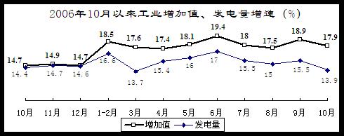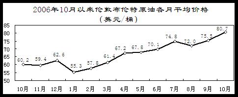 當(dāng)月全國(guó)原油產(chǎn)量同比增長(zhǎng)1.9%;原油加工量增長(zhǎng)6%,增速比上月加快0.3個(gè)百分點(diǎn),其中汽油、柴油產(chǎn)量均增長(zhǎng)4.7%。天然氣產(chǎn)量增長(zhǎng)24.3%,比上月減緩5.6個(gè)百分點(diǎn)。國(guó)際原油價(jià)格繼續(xù)上漲。當(dāng)月布倫特原油平均價(jià)格80.7美元/桶,比上月上漲5.2美元/桶,同比上漲20.5美元/桶,漲幅分別為7%和34.2%。受國(guó)際油價(jià)快速上漲、國(guó)內(nèi)油價(jià)調(diào)整預(yù)期增強(qiáng)等影響,部分地區(qū)成品油供應(yīng)趨緊。1-10月,全國(guó)原油產(chǎn)量15573萬(wàn)噸,增長(zhǎng)1.4%;進(jìn)口原油13668萬(wàn)噸(海關(guān)統(tǒng)計(jì)),增長(zhǎng)13.8%;原油加工量26993萬(wàn)噸,增長(zhǎng)6.6%,其中汽油、柴油產(chǎn)量分別增長(zhǎng)7.7%和5.8%。天然氣產(chǎn)量561億立方米,增長(zhǎng)20.1%。乙烯產(chǎn)量增長(zhǎng)14.3%,燒堿、純堿產(chǎn)量分別增長(zhǎng)15.8%和11%,化肥、農(nóng)藥產(chǎn)量分別增長(zhǎng)13.6%和21.3%。