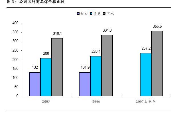 從上表我們可以分析得出以下結(jié)論:1、在長約合同中坑口煤的比重在不斷下降,07 年上半年坑口煤基本沒有長期合約,只有現(xiàn)貨市場銷售。2、下水煤與直達煤都在增長,下水煤的增長速度快于直達煤,下水煤在總煤炭銷售中的比重不斷提高。3、相對與現(xiàn)貨市場表現(xiàn),長約合同煤有較大的提價空間。