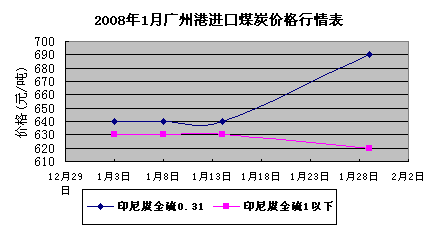 2008年1月份廣州港進口煤炭印尼煤(全硫0.31)價格整體走勢先穩(wěn)后揚。一月上半月價格保持平穩(wěn),保持在640元/噸,下半月價格呈上升趨勢,攀幅50元/噸,至690元/噸。