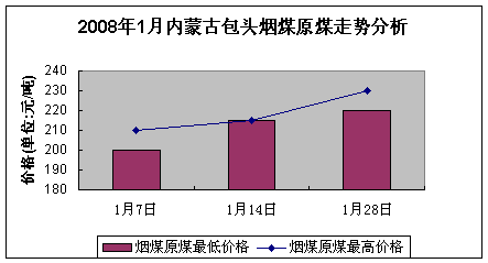 2008年1月份內(nèi)蒙古包頭煙煤原煤價格整體走勢呈小幅上升趨勢;價格波幅甚小。煙煤原煤最低價格由月初的200元/噸攀升至月中220元/噸, 攀幅10元/噸,煙煤原煤最高價格由月初的210元/噸攀升至月中230元/噸,攀幅10元/噸,皆波幅甚小。
