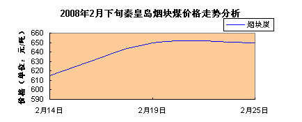 2008年2月下旬秦皇島煙塊煤價(jià)格走勢(shì)呈上揚(yáng)態(tài)勢(shì),由615元/噸攀升至650元/噸,波幅35元/噸。