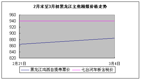 2月末,黑龍江地區(qū)隨著煤礦的陸續(xù)開工,資源供應(yīng)緊張緩解,價格近期較穩(wěn)定;3月初,由于煉焦煤的需求加大,煉焦煤有輕微上漲,幅度在10-20元水平。