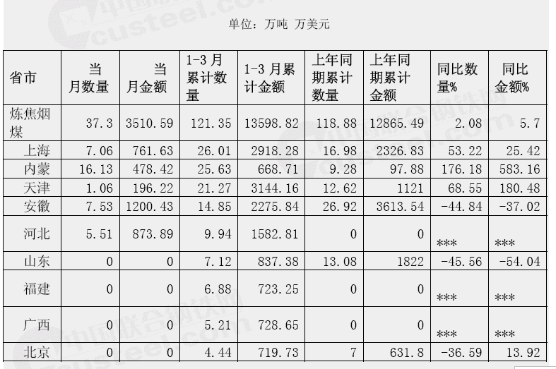 2008年3月我國煉焦煤分省市進口情況