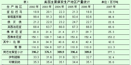 美國的煤炭生產(chǎn)主要集中在西部地區(qū)(圖2),2007年西部地區(qū)的產(chǎn)量達(dá)6.21億噸,占美國總產(chǎn)量的54.2%,主要生產(chǎn)礦山為露天礦;其次阿巴拉契亞(Appalachian)地區(qū)為3.77億噸,占美國總產(chǎn)量的32.9%,主要生產(chǎn)礦山為地下礦;中部地區(qū)的產(chǎn)量為1.47億噸,占美國總產(chǎn)量的12.8%。美國主要地區(qū)煤炭生產(chǎn)見表1。
