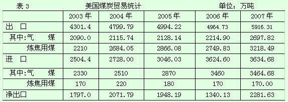 2007年美國的煤炭出口量比2006年增加960萬噸,為5920萬噸,比2006年增長19.4%,平均出口價(jià)為70.25美元/噸,比2006年減少0.68美元/噸。2007年美國的煤炭進(jìn)口量達(dá)3630萬噸,比2006年增長0.3%,平均進(jìn)口價(jià)為47.64美元/噸,比2006年減少1.46美元/噸。