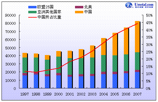 進(jìn)入21世紀(jì)以后的7年間,中國進(jìn)口鐵礦石增長了366%,亞洲其他國家僅增長了10.6%,歐洲僅增長了0.07%,美國進(jìn)口量甚至大幅下降了32.4%(表2),90年代歐洲亞洲進(jìn)口量平分秋色的局面已經(jīng)徹底改變,由于中國因素,2007年亞洲進(jìn)口量已是歐洲的3倍多。中國進(jìn)口鐵礦石達(dá)到了全球海運(yùn)貿(mào)易量的49%,2000年這一比例僅為15%,隨著中國進(jìn)口量繼續(xù)猛增加,鐵礦石海運(yùn)貿(mào)易的重心還在繼續(xù)向亞洲轉(zhuǎn)移(圖2)。