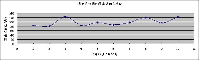 5月11日-5月20日這段時間內(nèi),接卸最多的一天為125列,最少的一天為81列。其中5月13日接卸車數(shù)最多為125列;5月12日接卸車數(shù)最少為81列;5月11日、14日接卸車數(shù)在83列左右;5月15日、17日、19日接卸車數(shù)在97列左右,5月16日接卸車數(shù)為87列;5月18日、20日接卸車數(shù)在122列左右。本月中旬接卸車數(shù)比本月上旬接卸車數(shù)量有所增多,煤炭卸車數(shù)量的增多并未緩減秦皇島煤炭市場供應(yīng)緊張,仍不能滿足市場的需求。