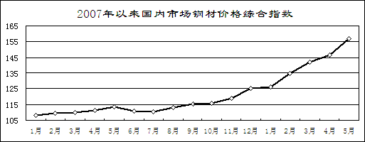 5月份,全國(guó)粗鋼產(chǎn)量同比增長(zhǎng)10.5%,增速比上月加快0.3個(gè)百分點(diǎn);鋼材產(chǎn)量增長(zhǎng)13.6%,加快1.9個(gè)百分點(diǎn)。鋼材出口556萬(wàn)噸,比上月增加78萬(wàn)噸;進(jìn)口2萬(wàn)噸,與上月持平。鋼材價(jià)格漲勢(shì)不減。月末,國(guó)內(nèi)市場(chǎng)鋼材價(jià)格綜合指數(shù)156.86點(diǎn),比上月末上漲10.38點(diǎn),比年初上漲31.74點(diǎn),同比上漲43.52點(diǎn)。6.5mm盤(pán)條、10mm中板、0.5mm冷軋薄板平均價(jià)分別為5832元/噸、6702元/噸和7221元/噸,比上月末上漲12%、6.2%和6%,同比上漲59.1%、47.7%和31.6%。