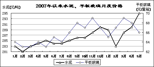 5月份,全國(guó)水泥產(chǎn)量同比增長(zhǎng)7.5%,增速比上月減緩3.3個(gè)百分點(diǎn);平板玻璃產(chǎn)量增長(zhǎng)14.3%,加快7.2個(gè)百分點(diǎn)。水泥價(jià)格上漲較多,平板玻璃價(jià)格回落。當(dāng)月重點(diǎn)建材企業(yè)水泥平均出廠價(jià)295元/噸,比上月上升5元/噸,同比上升10元/噸;平板玻璃出廠價(jià)66元/重量箱,比上月回落2元/重量箱,同比上升3元/重量箱。