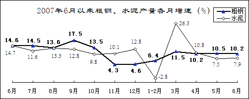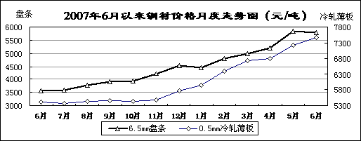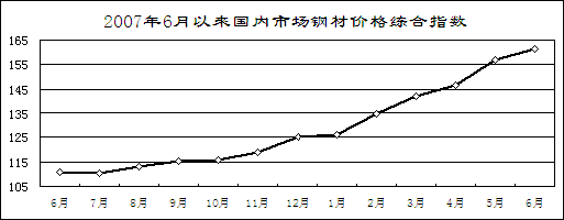 鋼材價(jià)格持續(xù)上漲。6月末,國(guó)內(nèi)市場(chǎng)鋼材價(jià)格綜合指數(shù)161.47點(diǎn),為歷史最高水平,比年初上漲36.35點(diǎn),同比上漲50.76點(diǎn)。6.5mm盤條、16mm鋼筋價(jià)格分別為5777元/噸和5552元/噸,同比分別上漲62.4%和60.6%;10mm中板、0.5mm冷軋薄板價(jià)格分別為6793元/噸和7479元/噸,同比上漲53.2%和38.3%。前五個(gè)月,冶金行業(yè)實(shí)現(xiàn)利潤(rùn)1426億元,增長(zhǎng)50.8%。