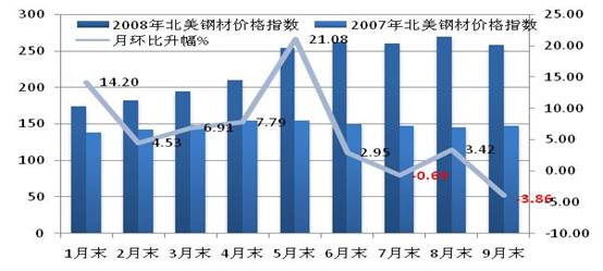 2、 前三個(gè)季度美國經(jīng)濟(jì)減速明顯,二季度經(jīng)濟(jì)增長修正后的數(shù)值為2.8%,比早先估計(jì)的數(shù)值大約縮水了0.5個(gè)百分點(diǎn)。三季度增長預(yù)計(jì)低于1%。然而受惠于粗鋼產(chǎn)量增長較慢的形勢,北美鋼材市場價(jià)格回落走勢遠(yuǎn)遠(yuǎn)小于亞洲市場。美國粗鋼產(chǎn)量在6月和9月為同比負(fù)增長,除1月份外其他月份增長也明顯低于全球同期增長速度。1-9月美國粗鋼產(chǎn)量同比增長4%,增速低于全球產(chǎn)量增速0.6個(gè)百分點(diǎn)。同時(shí),鋼材庫存和進(jìn)口數(shù)量始終處于較低水平,資源供求基本平衡成為鋼價(jià)高位運(yùn)行的主要原因。9月末,CRU北美鋼材綜合價(jià)格指數(shù)降至263.8點(diǎn),環(huán)比上月降幅達(dá)3.86%,同比上升54.99%。1-9月平均價(jià)格指數(shù)為258.7點(diǎn),同比上升75.27%。