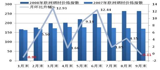 歐洲地區(qū)受美國金融危機(jī)的影響經(jīng)濟(jì)增長明顯減速,根據(jù)歐盟統(tǒng)計(jì)局的數(shù)字,二季度歐元經(jīng)濟(jì)區(qū)經(jīng)濟(jì)較一季度下降0.2%,是至1995年有統(tǒng)計(jì)記錄以來歐元區(qū)經(jīng)濟(jì)季度環(huán)比首次出現(xiàn)負(fù)增長,預(yù)計(jì)三季度將會再次出現(xiàn)負(fù)增長。英國三季度環(huán)比季降0.5%,是近年來首次經(jīng)濟(jì)負(fù)增長,德國、法國和意大利等國家經(jīng)濟(jì)增長也陷于停滯和負(fù)增長的困境。歐盟(27國)1-5月粗鋼產(chǎn)量同比降低了0.7%,6-7月和第三季度產(chǎn)量略有增加,同比增長了2.1%;1-9月粗鋼產(chǎn)量同比僅增長了1.2%。在進(jìn)口下降和出口增長的情況下,資源供需基本平衡。廢鋼等原料價(jià)格大幅回落,今年前7個(gè)月,國際市場廢鋼、生鐵價(jià)格一路攀升,7月初CRU廢鋼價(jià)格指數(shù)曾達(dá)到496點(diǎn),同比上升了1.12倍;8-9月廢鋼價(jià)格迅速回落,9月末至322.3點(diǎn),但仍比上年同期上升了38.0%。廢鋼成本上升對鋼材價(jià)格形成有利支撐,但很顯然支撐的力度在減弱。至9月末,CRU歐洲鋼材綜合價(jià)格指數(shù)降至263.8點(diǎn),環(huán)比上月降幅0.11%,同比上升54.99%。1-9月平均價(jià)格指數(shù)為221.8點(diǎn),同比上升48.84%。