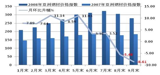 亞洲地區(qū)經(jīng)濟(jì)增長迅猛,在需求強(qiáng)勁增長和原燃材料價(jià)格大幅上升的推動下,1-7月亞洲市場鋼材價(jià)格迅速上升,至7月末CRU亞洲鋼材價(jià)格指數(shù)達(dá)到323.1點(diǎn),同比上升82.23%,比北美地區(qū)和歐洲地區(qū)升幅分別高5.9和37.4個(gè)百分點(diǎn)。受美國次貸危機(jī)引發(fā)的金融風(fēng)暴影響,以及中國舉辦奧運(yùn)會以及自然災(zāi)害等多重因素的共同作用下,8-9月中國市場鋼材價(jià)格急劇滑落,并帶動亞洲市場鋼材綜合價(jià)格指數(shù)呈現(xiàn)為明顯的下跌態(tài)勢,至9月末,價(jià)格指數(shù)降至279.1點(diǎn),同比上升51.77%。1-9月平均價(jià)格指數(shù)為258.7點(diǎn),同比上升75.27%。