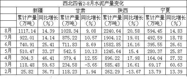 相比固定資產(chǎn)投資增速的穩(wěn)步提升,西北水泥的產(chǎn)量投放卻并沒(méi)有同步躍進(jìn)。數(shù)字水泥網(wǎng)統(tǒng)計(jì)顯示,今年2-8月份新疆、甘肅、陜西、寧夏四省的水泥產(chǎn)量月度平均增幅分別為32.85%、7.04%、13.15%和26.77%。除新疆水泥產(chǎn)量的釋放月度增幅高于當(dāng)?shù)毓潭ㄙY產(chǎn)投資增速外,寧夏、甘肅、陜西三省水泥產(chǎn)量月度增速與固定資產(chǎn)投資月度增速中存在著最高25個(gè)百分點(diǎn)的增幅缺口。