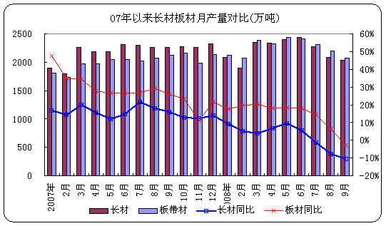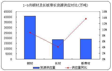 今年以來,國內(nèi)鋼材總體產(chǎn)量增速呈逐步放緩趨勢,其中長材產(chǎn)量始終保持低增增長,前三季度累計產(chǎn)量僅較去年同期增加2%,同期鋼材和板帶材則分別增加8.1%和14.3%,且7、8、9三個月長材產(chǎn)量持續(xù)出現(xiàn)負增長,9月產(chǎn)量同比下降了10個百分點。之所以如此,關(guān)鍵在于近兩年新增產(chǎn)能絕大部分是板帶材,同時長材產(chǎn)品中的螺線生產(chǎn)企業(yè)不少是民營企業(yè),產(chǎn)量很容易受到盈利、成本等因素的影響;诖耍1-9月長材供應量同比增加約4個百分點,板帶材則增加13.6%。在大致相當?shù)男枨蟓h(huán)境下,資源供應量增幅有限為長材市場贏得了較好的抗跌性。