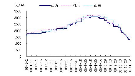 據蘭格鋼鐵信息研究中心市場監(jiān)測顯示:目前山西地區(qū)二級冶金焦價格在1200-1300元/噸,較上半年最高點回落1700-1800元/噸;河北地區(qū)二級冶金焦價格在1500元/噸,較上半年最高點回落1600元/噸;山東地區(qū)二級冶金焦價格在1500元/噸,較上半年最高點回落1600-1700元/噸;其它地區(qū)價格跌幅基本在1400-1700元/噸之間;整體較上半年最高點回落55-65%(詳見圖一)。現(xiàn)階段國內焦炭市場呈現(xiàn)出供大于求、經濟狀況走向虧本、行業(yè)面臨著新一輪的洗牌。尤其是今年兩度上調關稅,作為“兩高一資”行業(yè),第四季度乃至2009年上半年,焦炭業(yè)兼并重組步伐將進一步加快,焦企正在經歷著艱難調整期,整體市場步入低谷。