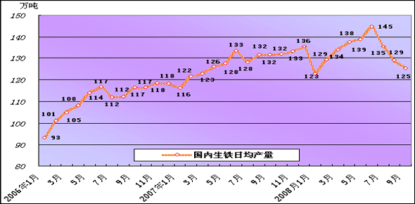 『國(guó)內(nèi)方面』2008年9月,中國(guó)生鐵產(chǎn)量較8月份有所下降,日均產(chǎn)量也出現(xiàn)回落。根據(jù)國(guó)家統(tǒng)計(jì)局統(tǒng)計(jì)的數(shù)據(jù)顯示:2008年9月,全國(guó)生鐵產(chǎn)量共計(jì)3754.95萬(wàn)噸,比8月份減少了249.59萬(wàn)噸,與去年同期相比產(chǎn)量減少了196.33萬(wàn)噸,降幅6.1%。1-9月累計(jì)生產(chǎn)生鐵36673.52萬(wàn)噸,同比累計(jì)增幅5.1%。9月份中國(guó)生鐵日均產(chǎn)量為125.2萬(wàn)噸,較8月份的129.18萬(wàn)噸略減少3.98萬(wàn)噸。參考圖三、圖四。