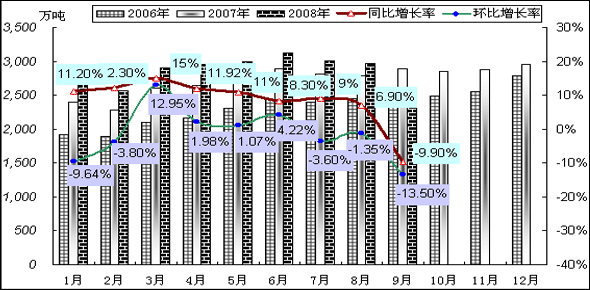 表一 2008年9月份焦炭產(chǎn)量及環(huán)比增長(zhǎng)率