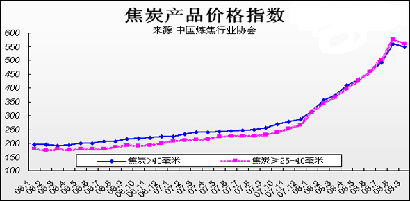 根據(jù)中國(guó)煉焦行業(yè)協(xié)會(huì)和冶金價(jià)格信息中心發(fā)布的中國(guó)焦化產(chǎn)品價(jià)格指數(shù)顯示,2008年1-9月,國(guó)內(nèi)焦炭市場(chǎng)價(jià)格指數(shù)快速走高,9月份焦炭產(chǎn)品(>40毫米)指數(shù)回落至548.82,與7月份相比上漲了11.22點(diǎn)。參考圖十。