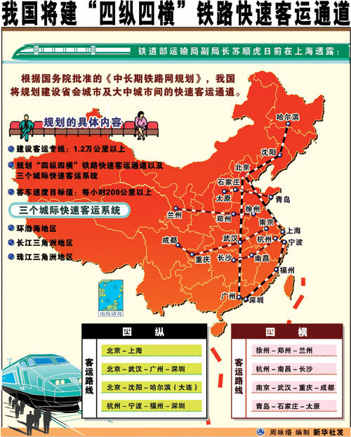 在原“四縱四橫”客運(yùn)專線基礎(chǔ)骨架上,進(jìn)一步延伸并擴(kuò)大客運(yùn)專線覆蓋面,加強(qiáng)客運(yùn)專線之間相互連通和銜接;進(jìn)一步擴(kuò)大城際客運(yùn)系統(tǒng)的組團(tuán)建設(shè),在環(huán)渤海、長三角、珠三角城際鐵路的基礎(chǔ)上,加快了長株潭、成渝、中原、武漢、關(guān)中、海峽西岸城鎮(zhèn)群等經(jīng)濟(jì)發(fā)達(dá)和人口稠密地區(qū)的城際軌道交通建設(shè)步伐,客運(yùn)專線及城際鐵路建設(shè)目標(biāo)由1.2萬公里調(diào)整為1.6萬公里以上,并與既有線提速改造工程相銜接,未來我國將形成連接所有省會(huì)及50萬人口以上的城市,覆蓋全國90%以上人口,總里程達(dá)到5萬公里以上的快速客運(yùn)網(wǎng),這將大大縮短城市間時(shí)空距離,省會(huì)城市間總旅行時(shí)間節(jié)省50%以上。
