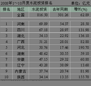 各省市狀況來看,投資累計完成額排名前10的省市基本保持穩(wěn)定,1~10月份共完成投資額504.09億元,占全國水泥累計投資總額的62.89%。其中,中南6個省份中的4個(河南、湖北、湖南和廣西)進(jìn)入排名前10,特別是河南省居全國首位,1~10月累計完成投資額69.89億元,但同比增速為28.50%,全國排名后10。
