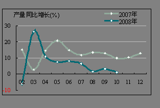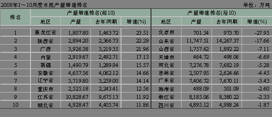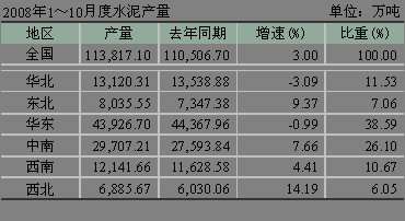 從1~10月份水泥累計產(chǎn)量看,為113,817.10萬噸,同比增長僅3.00%。華北、華東地區(qū)甚至出現(xiàn)負(fù)增長,華北為-3.09%,華東為-0.99%。