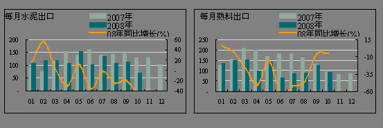 受金融危機(jī)的影響,全球經(jīng)濟(jì)增長放緩,對水泥需求減緩,影響水泥產(chǎn)品的出口。10月份的水泥出口量進(jìn)一步減少,僅為68.15萬噸,環(huán)比下降39.71%,同比下降46.94%,較9月份下降近26個百分點;水泥熟料出口91.81萬噸,環(huán)比下降26.93%,同比下降5.17個百分點。